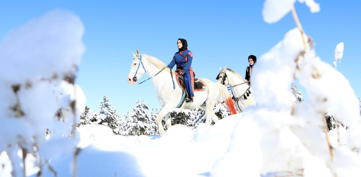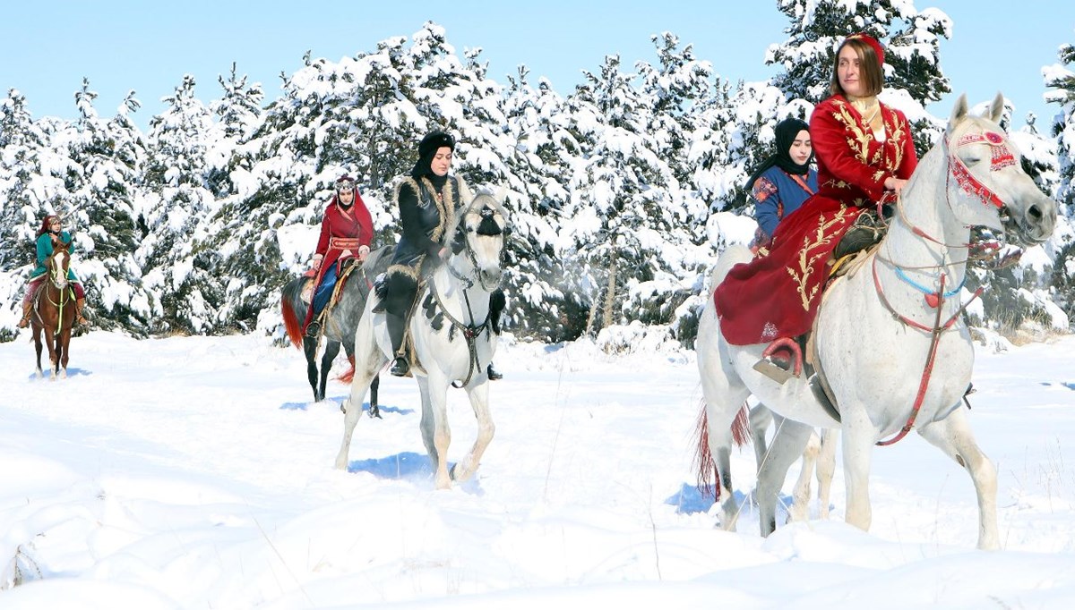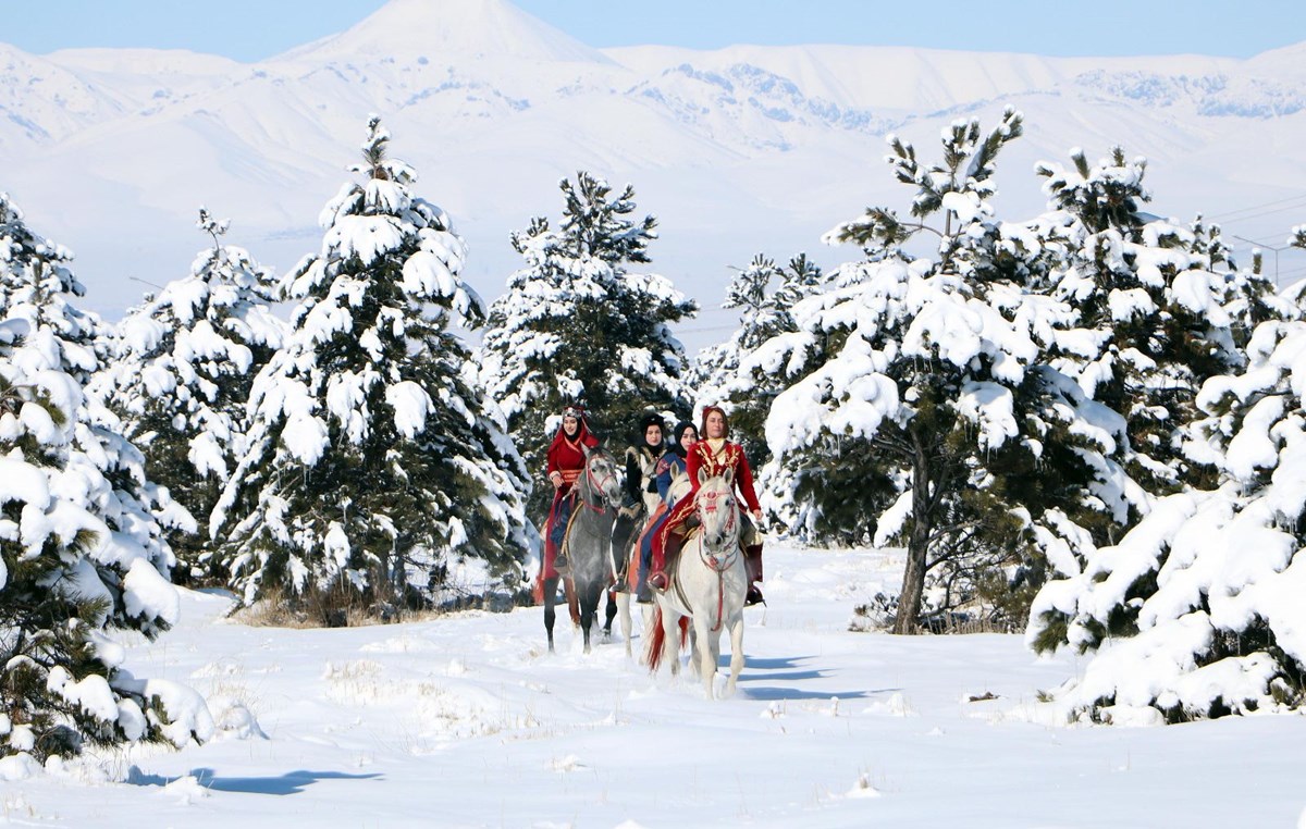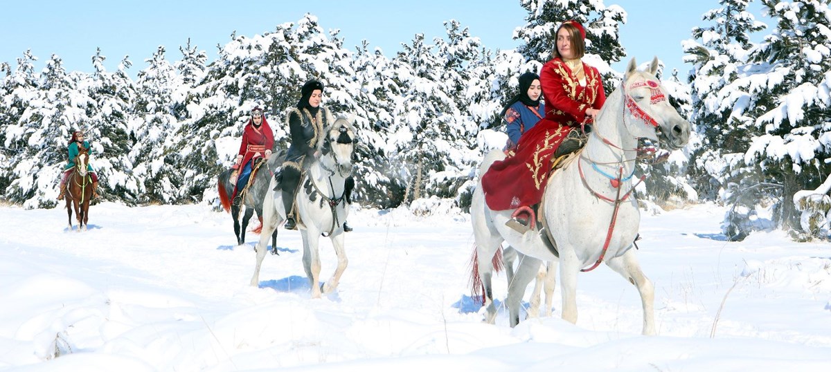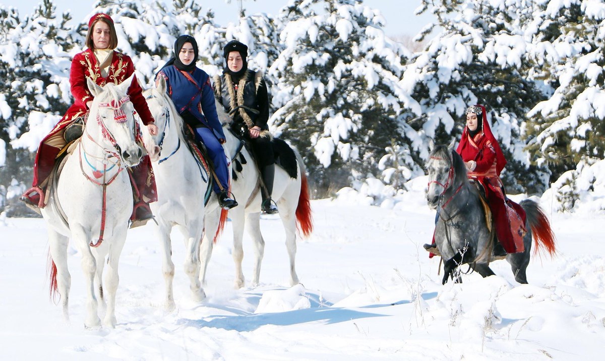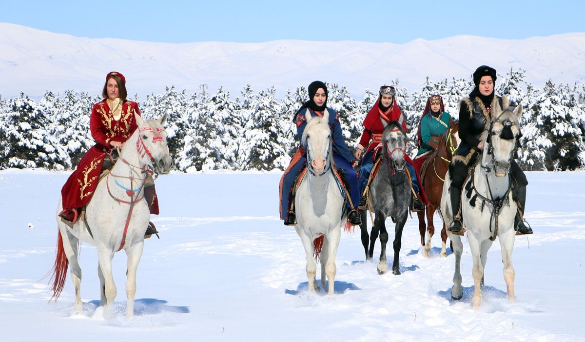 Yöresel kıyafetli Erzurumlu kadınlar karla kaplı ormanda atlı safari yaptı