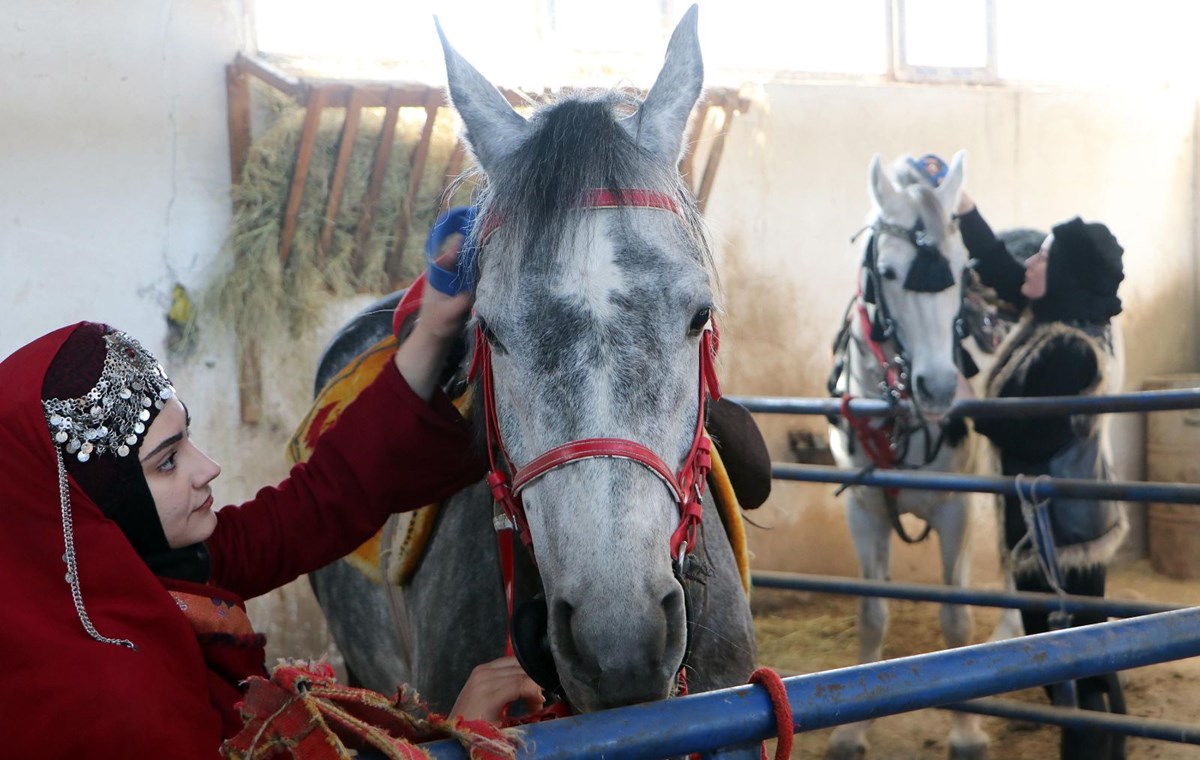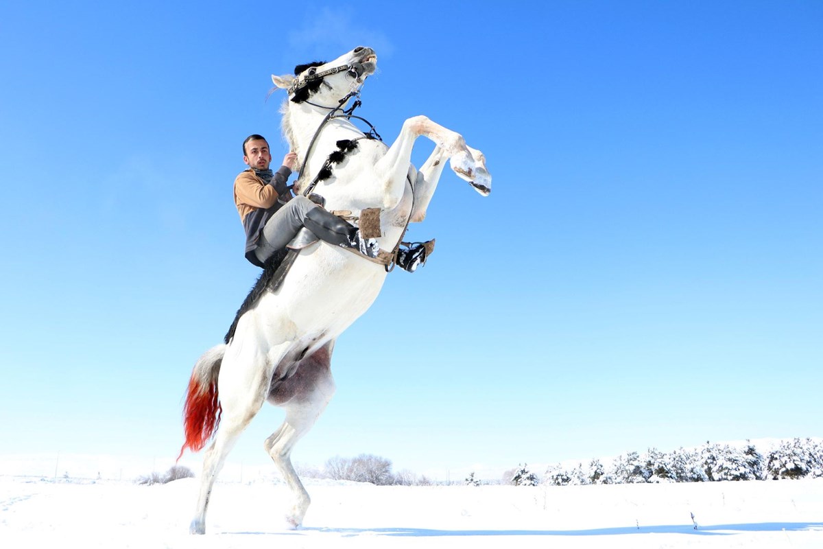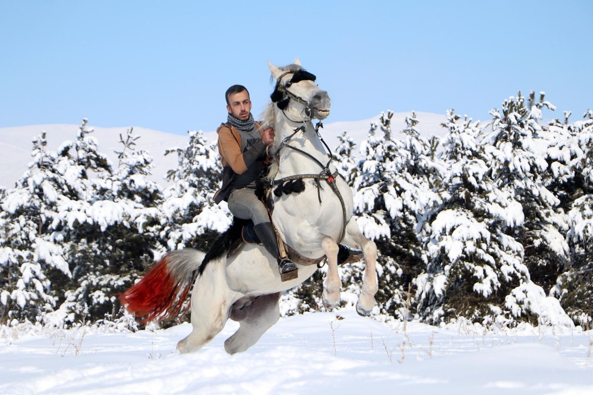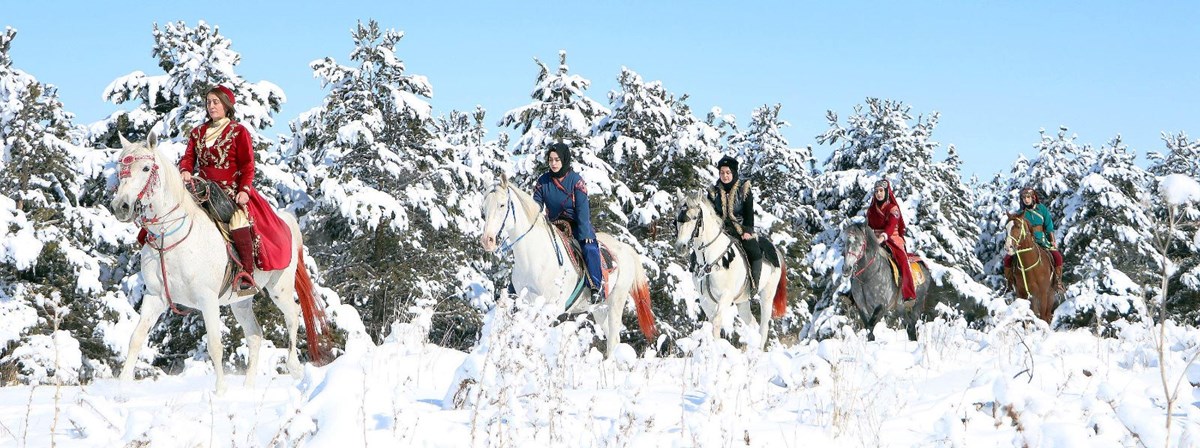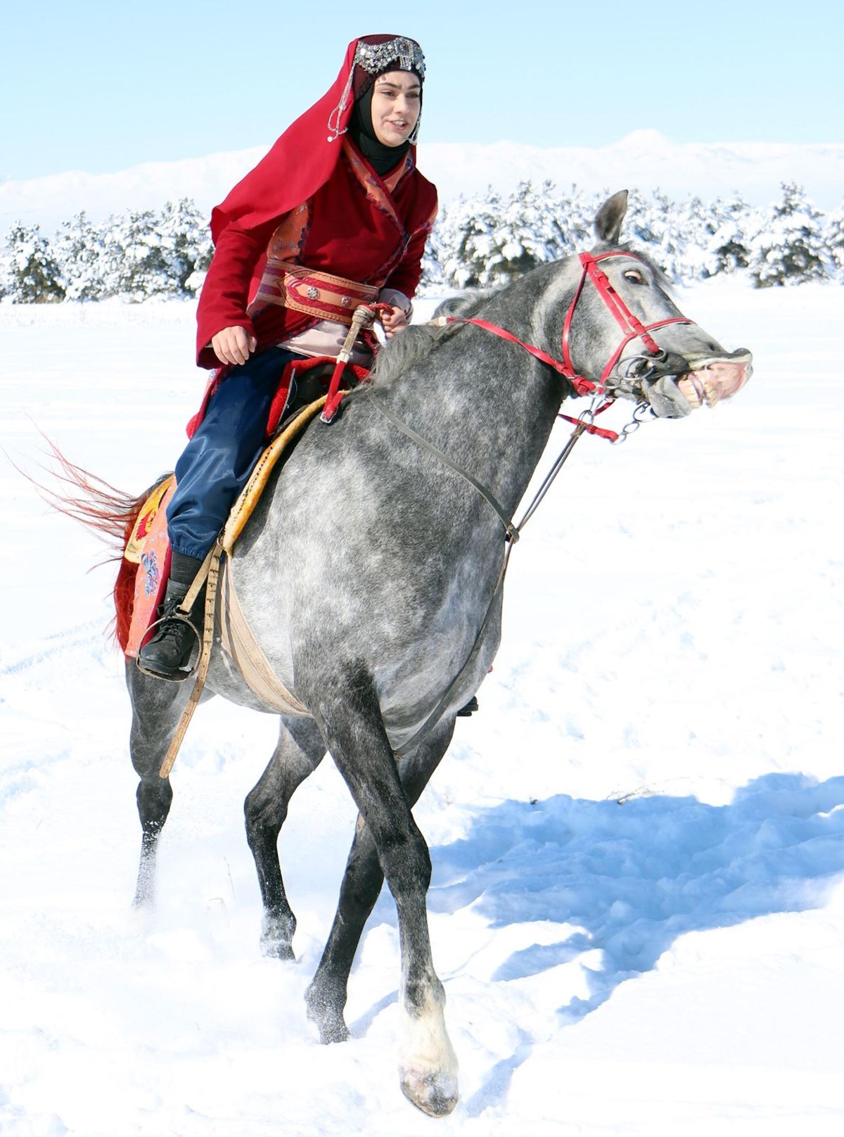 Erzurum Atatürk Üniversitesi yerleşkesindeki Kızıl Elma Geleneksel Sporlar ve Atlı Okçuluk Kulübü'nün kadın okçuları, bu kez ok atmayıp, kar keyfi yaptı. Atlarını hazırlayıp, ahırdan çıkaran kadın okçular, giydikleri özel kıyafetleriyle at binerek, kulübün önündeki karla kaplı ormanlık alana gitti.Kulüp Başkanı Ayşe Melek Okuyucu'yu tek sıra halinde takip eden kadınlar, tablo gibi görüntüler oluşturdu. Güneşli havada, beyaz ve yeşil tonlarının hakim olduğu üniversite yerleşkesinde zaman zaman atlarını dört nala süren kadınlar, dronla görüntülendi.Kızıl Elma Geleneksel Sporlar ve Atlı Okçuluk Kulüp Başkanı Okuyucu, amaçlarının geleneksel sporları gençlere ve çocuklara tanıtmak olduğunu söyledi. Okuyucu, "Geleneklerimizi ve kültürümüzü elimizden geldiğince yaşatabilmek istiyoruz. Kış aylarında ise geleneksel kültürümüzü yansıtan Erzurum manzarasının tadını çıkarmak istiyoruz. Biraz soğuk olsa da bu güzellik ve aldığımız haz onu bastırıyor. Güzel memleketimizin böylesine güzel tabiatında atlarımızla birlikte eğleniyor, safariler yapıyoruz. Bizimle birlikte olmak isteyenler, belli bir eğitim aldıktan ve güven sağladıktan sonra kulübümüze üye olabilirler" diye konuştu.3 yıldır okçuluk, 2 yıldır da binicilik yaptığını söyleyen Zeynep Koçhan (19), "Tarihi, geçmişimizi temsil ediyor olmak çok güzel bir duygu. Safarilere çıkıyoruz ardından talimlerimizi yapıyoruz. Her sabah ilk işimiz atların tımarını yapmak oluyor. Temizleyip, eyerliyoruz sonrasında hep birlikte safariye çıkıyoruz. Çok eğlenceli ve güzel vakit geçiriyoruz. Tabi geleneksel okçuluk yaptığımız için de geleneksel kıyafetler tercih ediyoruz” dedi.Kulübe geldiğinde geçmişi yaşadığını söyleyen üniversite öğrencisi Selenay Atasever (20) ise "Buraya geldiğimiz zaman geçmişimizi yaşıyor ve yaşatıyoruz. At biniyoruz ve ruhsal anlamda bu bize çok iyi geliyor. At, tarihimizde atalarımızın saygı duyduğu hayvanlardır. Biz de mutlulukla biniyoruz. Atlı okçuluk yapıyoruz. At üstünde ok atıyoruz. Ruhsal anlamda da iyi geliyor. Ortamımız safari yapmaya da uygun. Ağaçlıkların içinde atla geziyoruz. Doğayla iç içe çok güzel duygular yaşıyoruz. Sevdiğimiz hayvanların bizi anladığına inanıyorum" diye konuştu